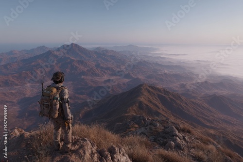 adventurer, mountain, peak, landscape, mist, hill, view, nature, exploration, scenic, horizon, backpack, solitude, traveler, fog, dawn, terrain, sunlight, sky, adventure, rugged, summit, journey, breathtaking, wildlife, freedom, earth, elevation, calmness, hiking, environment, beauty, remote, serene, natural, distant, huge, observation, peaceful, excursion, wonder, fresh air, perspective, panoramic, wanderlust