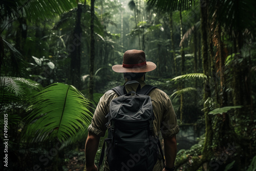 adventurer, rainforest, exploration, jungle, foggy, mist, nature, travel, tropical, greenery, backpack, hat, wanderlust, lush, outdoors, environment, eco, tour tourism, adventure, male, person, forest, tranquil, wilderness, solitude, friendly, hiking, natural, landscape, dense, vegetation, scenic, mystery