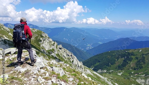 Adventurer Surveys Expansive Mountainscape on Sunny Day with Cloud Accents
