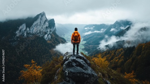 Adventurous Hiker Standing on Rocky Outcrop Overlooking Majestic Mountain Valley with Mist and Clouds in Expansive Autumn Landscape
