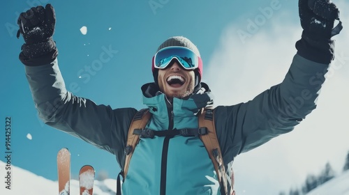 Adventurous man skier glides through snowy mountain landscape.