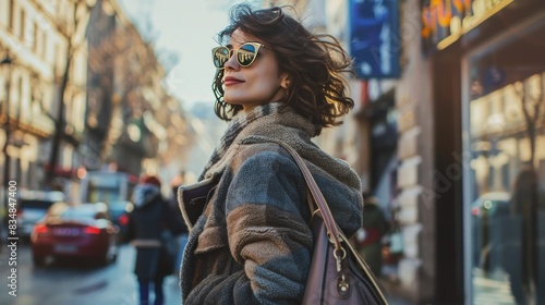 Adventurous millennial, laden with bags, revels in incredible deals abroad, sporting chic sunnies and a cozy jacket.