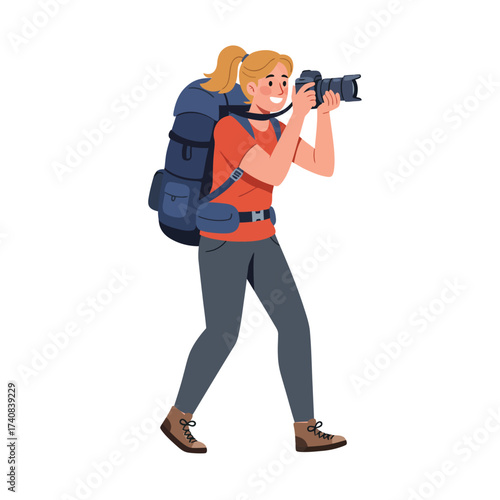 Adventurous young woman photographer capturing stunning landscapes with backpack and camera illustration