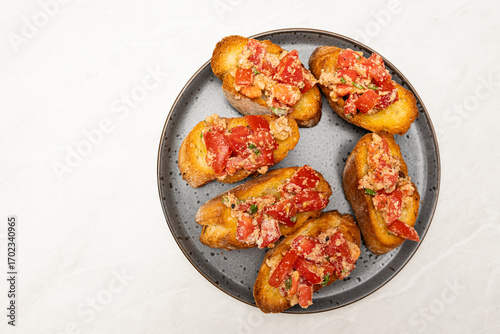 Advertising Background – Baguette Slices with Tomato and Cheese, Overhead Shot