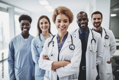 Advertising portrait shot of a doctor team standing together in a hospital and they look at the camera. Generative AI.