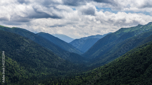 mountain, mountain, landscape, nature, sky, view, summer, cloud, vale, green, panorama, forest, blue, travel, hill, cloud, alps, peak, grass, tree, rock, panoramic, hiking, tree, russia, caucasia
