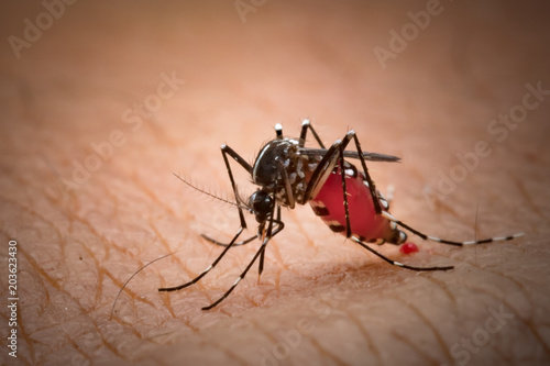 Aedes aegypti Mosquito. Close up a Mosquito sucking human blood,Mosquito Vector-borne diseases,Chikungunya.Dengue fever.Rift Valley fever.Yellow fever.Zika.Mosquito on skin