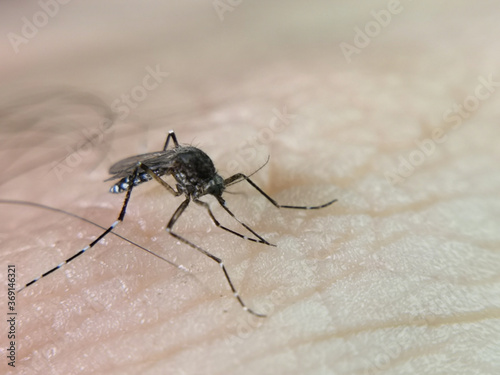 Aedes aegypti mosquito sucking blood. Macro photo. Close-up.