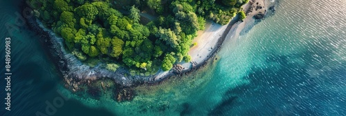 Aerial and Drone Photography captures a stunning coastal scene, showcasing vibrant greenery and clear blue waters