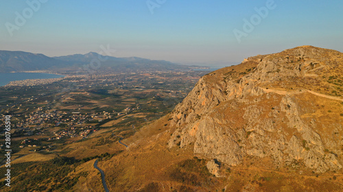 Aerial drone panoramic view of iconic uphill medieval castle of Acrocorinth an ancient citadel overlooking ancient Corinth, Peloponnese, Greece