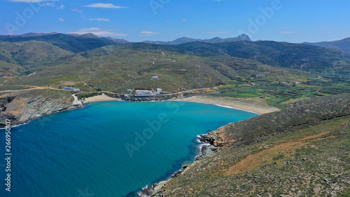 Aerial drone photo of famous beach of Kolympithres with deep turquoise sea, Tinos island, Cyclades, Greece