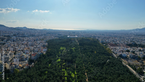 Aerial drone photo of famous park of Filadelfia or Philadelfia in a winter morning in the heart of Athens near Parnitha mountain, Attica, Greece