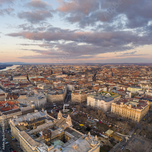 Aerial drone shot of Liberty Square Budapest downtown during sunset hour