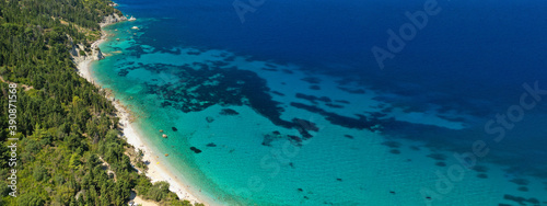 Aerial drone top down ultra wide photo of luxury yacht anchored in tropical exotic island turquoise sea