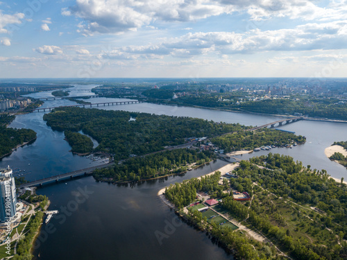 Aerial drone view. Automobile bridge over the Dnieper river in Kiev.