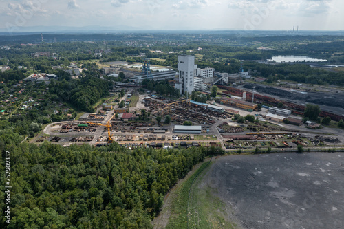 Aerial drone view of coal mine in Poland. Coal Mine in Jastrzebie-Zdroj and partly in Mszana in Wodzisław County. Coal mine seen from a bird's eye view