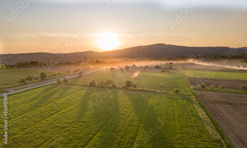 sunset, agriculture, field, aerial, drone, from above, countryside, landscape, mountain, tree, meadow, hill, view, summer, green
