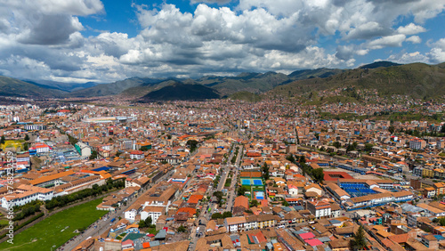 Aerial drone view of Cusco Cuzco Inca city in Peru