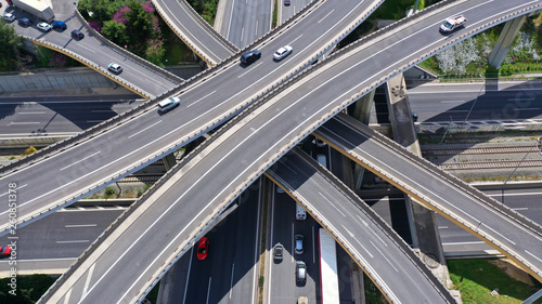 Aerial drone view of popular highway multilevel junction road, passing through National motorway in traffic jam