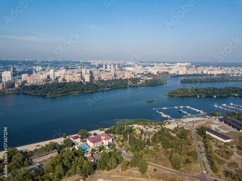 Aerial drone view of the Dnieper River in Kiev. Clear sunny day.