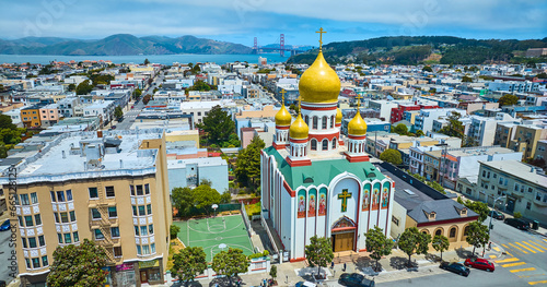 aerial, architecture, bridge, building, california, christianity, church, city, cross, drone, entrance, exterior, house, religion, residential, frisco, summer, tree, yellow, building, cathedral, crucifix, day, dome, door, 8, gold, golden gate bridge, housing, pointed, russian, us
