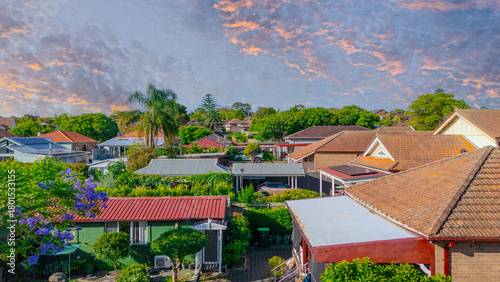 Aerial Panorama Drone View of a inner western Sydney Suburb of Ashbury Urban Sprawl and the terracotta roof tops streets and trees of Suburban Sydney NSW Australia