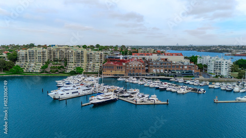 Aerial Panorama Drone view of Parramatta River Sydney Harbour between Balmain Gladesville Birkin Head Point and Roselle on the Bay Run Sydney NSW Australia