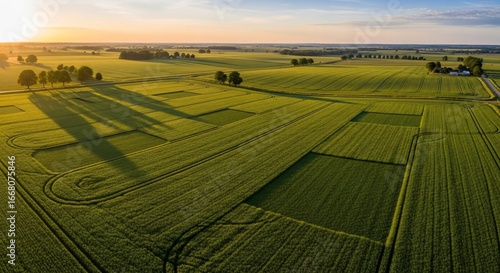 aerial, view, drone, photo, landscape, countryside, rural, farm, farmland, field, crop, agriculture, cultivation, nature, environment, green, gold, yellow, light, shadow, sun, sunset, sunrise, panorama, panoramic, wide, expanse, huge, horizon, sky, pattern, design, shape, aeroplane, plane, art, abstract, graphic, line, texture, perspective, high, angle, scenic, picturesque, beautiful