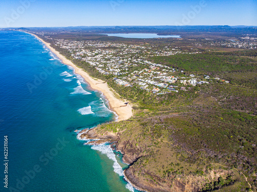 aerial panorama of beautiful coast of noosa national park; unique sandy beaches, cliffs and little bays with turquoise water near sunshine coast in south east queensland, australia