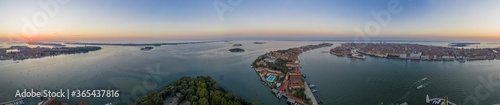 Aerial panorama of the lagoon of Venice and Lido island during sunrise