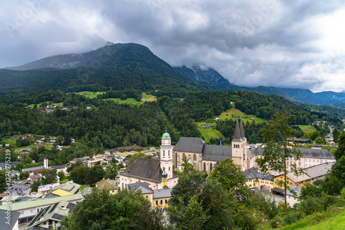 Aerial panorama view of the old town of Berchtesgaden with the Parish church St. Andreas and collegiate church St. Peter with Bavarian alps in background, on a cloudy day in summer, Bavaria, Germany