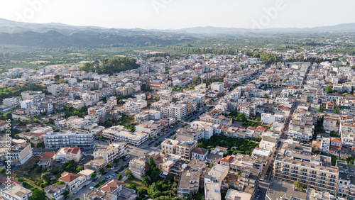 Aerial panoramic view of Sparta city with Taygetus mountains and ancient ruins remains in Peloponnese, Greece