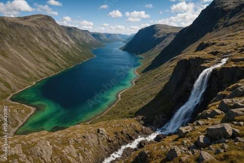 Aerial perspective of a majestic mountain overlooking a vibrant blue and green fjord, with cascading waterfalls and rugged, barren terrain
