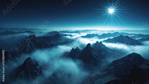 Aerial perspective of the black mountain ranges during the night, featuring misty peaks, fog-laden valleys, and radiant sunrays.
