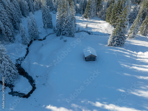 aerial photo of a little creek winding in the snowy landscape of the Hochhaedrich mountain area in the Bregenz Forest mountains in Vorarlberg, Austria