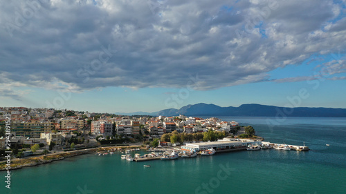 Aerial photo of famous seaside town of Halkida with beautiful clouds and deep blue sky, Evia island, Greece