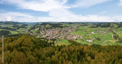 Aerial photo of the village of Oberstaufen in the Allgaeu Alps, Bavaria, Germany