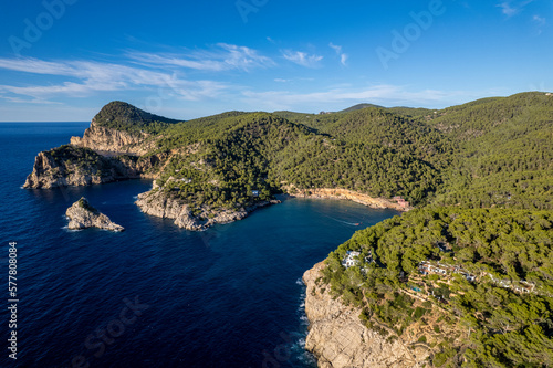 Aerial photographs of the beaches of Cala Salada y Cala Saladeta ,on the island of Ibiza during a sunny summer day with blue sky and turquoise water
