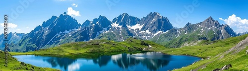 Aerial photography of a stunning mountain vista with a lake, aerial mountain vista, reflective lake among peaks