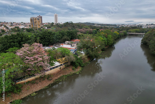 Aerial photography of the city of Piracicaba. Rua do Porto, recreation parks, cars, lots of vegetation and the Piracicaba river crossing the city.