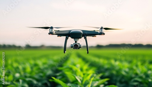 Aerial Precision Agriculture Drone Capturing High-Resolution Images of Vibrant Green Crop Field Close-Up