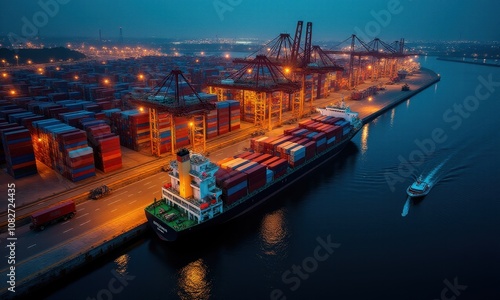port, container, terminal, dock, good, logistic, cargo, business, industry, water, ship, illumination, shipping, shore, warehouse, transport, vessel, seafaring, landscape, urban, industrial, marin, movement, container, evening, night time, economic, seaport, night view