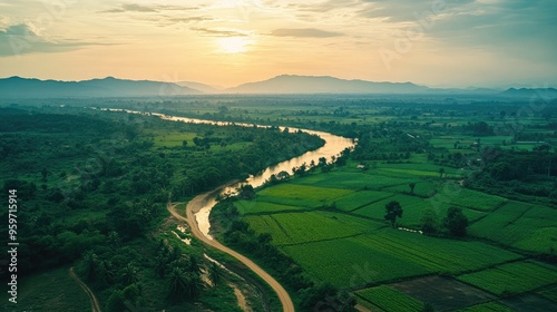 travel, aerial view, photo, rural scene, horizontal, river, idylli, calmness, color image, travel destination, nature, mekong delta, no people, tranquil scene, journey, vacation, southeast asia, sunset, tropical climate, environment, drone, village, morning, farm, mountain, tree, awe, background, siam, beauty, famous place, outdoors, forest, tour tourism, tropical rainforest, dusk
