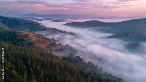 fog, mountain, landscape, aerial, sunrise, sunset, dawn, mist, cloud, hill, vale, nature, scenery, panorama, view, travel, destination, adventure, exploration, photo, drone, aerial view, picturesque, beautiful, scenic, majestic, tranquil, serene, peaceful, calm, environment, eco, ecology, wilderness, remote, untouched, vibrant, colours, purple, pink, orange, green, forest, tree, wood, vegetation, africa