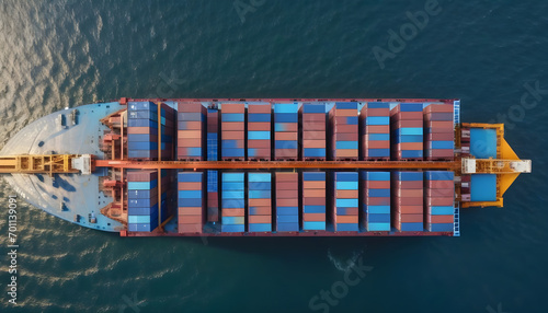 Aerial top view container ship full load container for logistics import export, shipping or transportation shipyard at sunrise, logistic import export and transport industry background