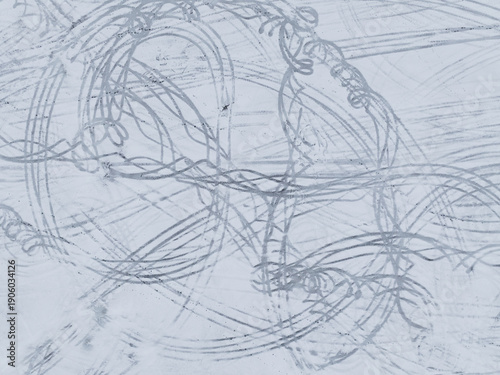 aerial, view, drone, ice, snow, winter, glacé, sea, ocean, track, tire, car, vehicle, drift, drifting, donut, pattern, abstract, texture, white, grey, cold, nature, arctic, north, landscape, background, minimalism, graphic, line, travel, adventure, frost, seasonal, surface, top, down, trace, motion, speed, drive, automotive, icy, water, environment, climate, extreme, slippery