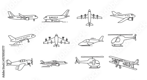 Aerial Vehicles Line Art Diverse Aircraft Designs for Aviation Enthusiasts and Creative Projects