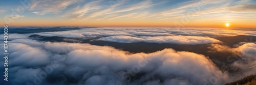 Aerial view above a cloud inversion at sunrise lake and beautiful sky