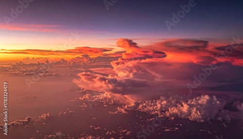 Aerial view captures a vibrant sunset. Intense hues paint the sky and cloud formations. Light filters creating an ethereal, dramatic scene