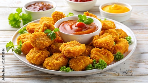 Aerial View: Crispy Chicken Nuggets with Dipping Sauce on Elegant White Plate, Bright Dining Setting